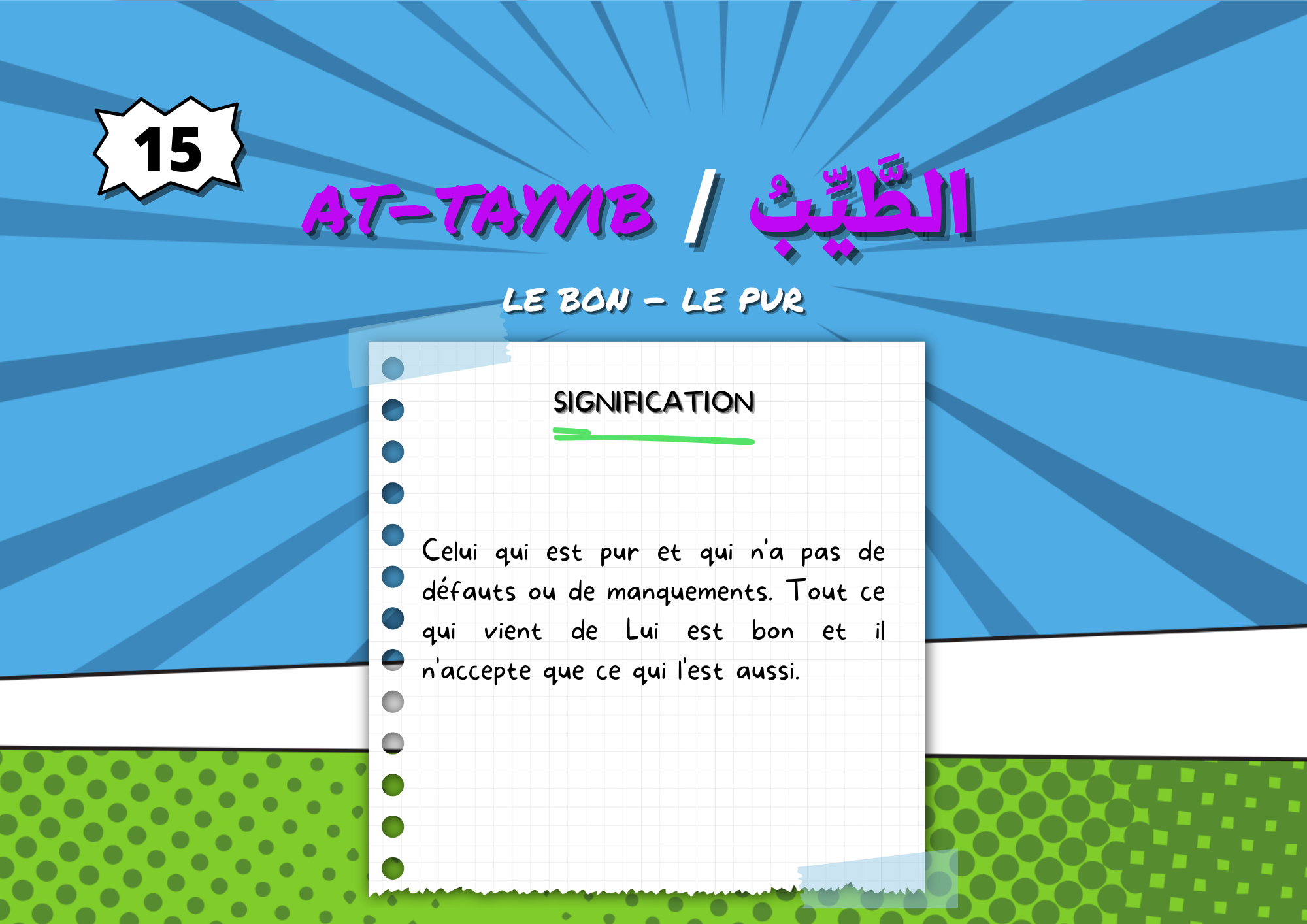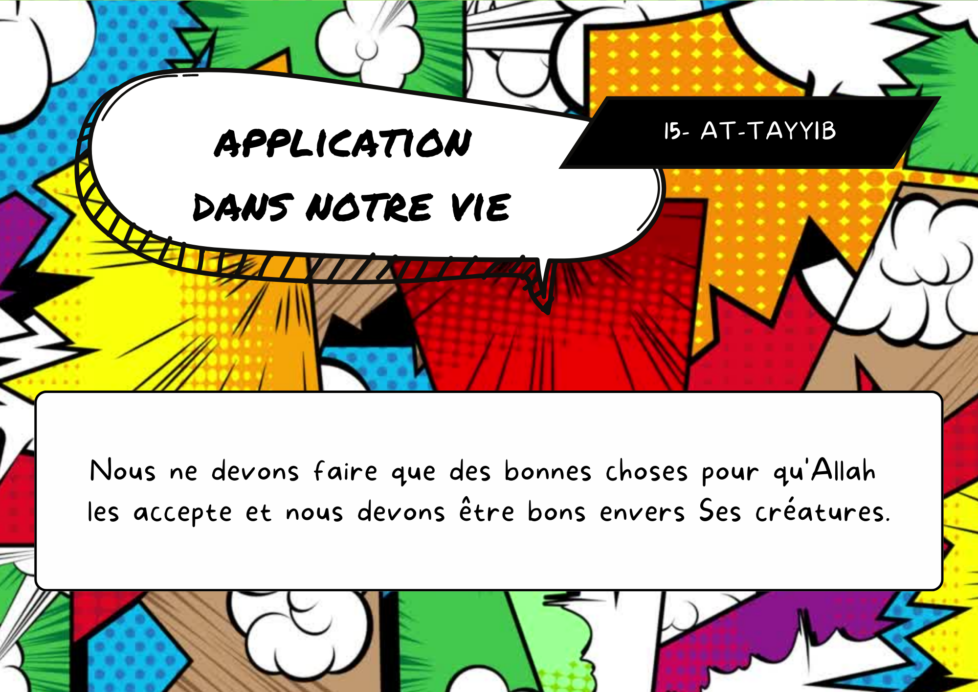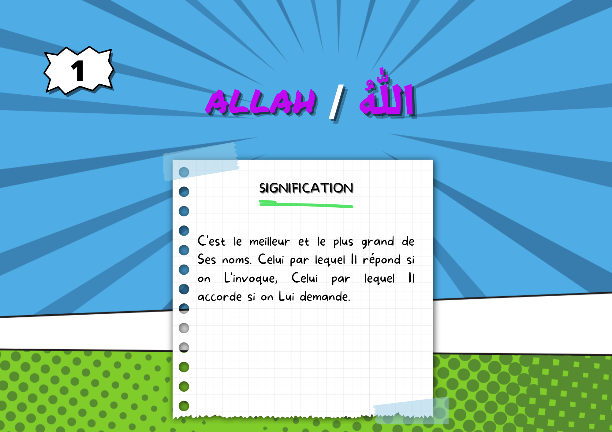 Il est important que l’enfant fasse le lien entre les Noms d’ALLAH et la source dans laquelle ils ont été extraits, ainsi il verra que le savoir religieux ne s’invente pas.